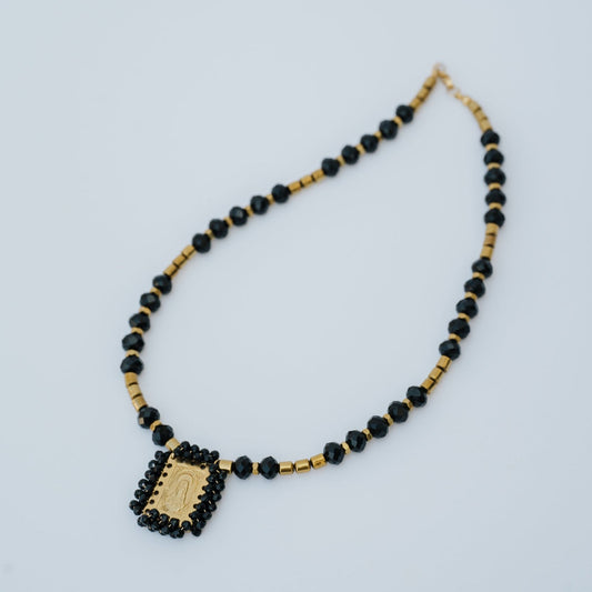 Colar Sagrado Coração - Colar Cristais Facetados Pretos, Hematites e Medalha Aço Inoxidavel