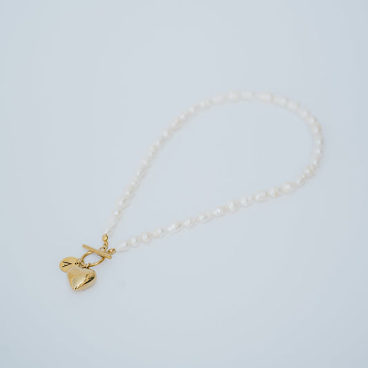 Colar Perolas Agua Doce, Coração e Inicial Aço Inoxidável