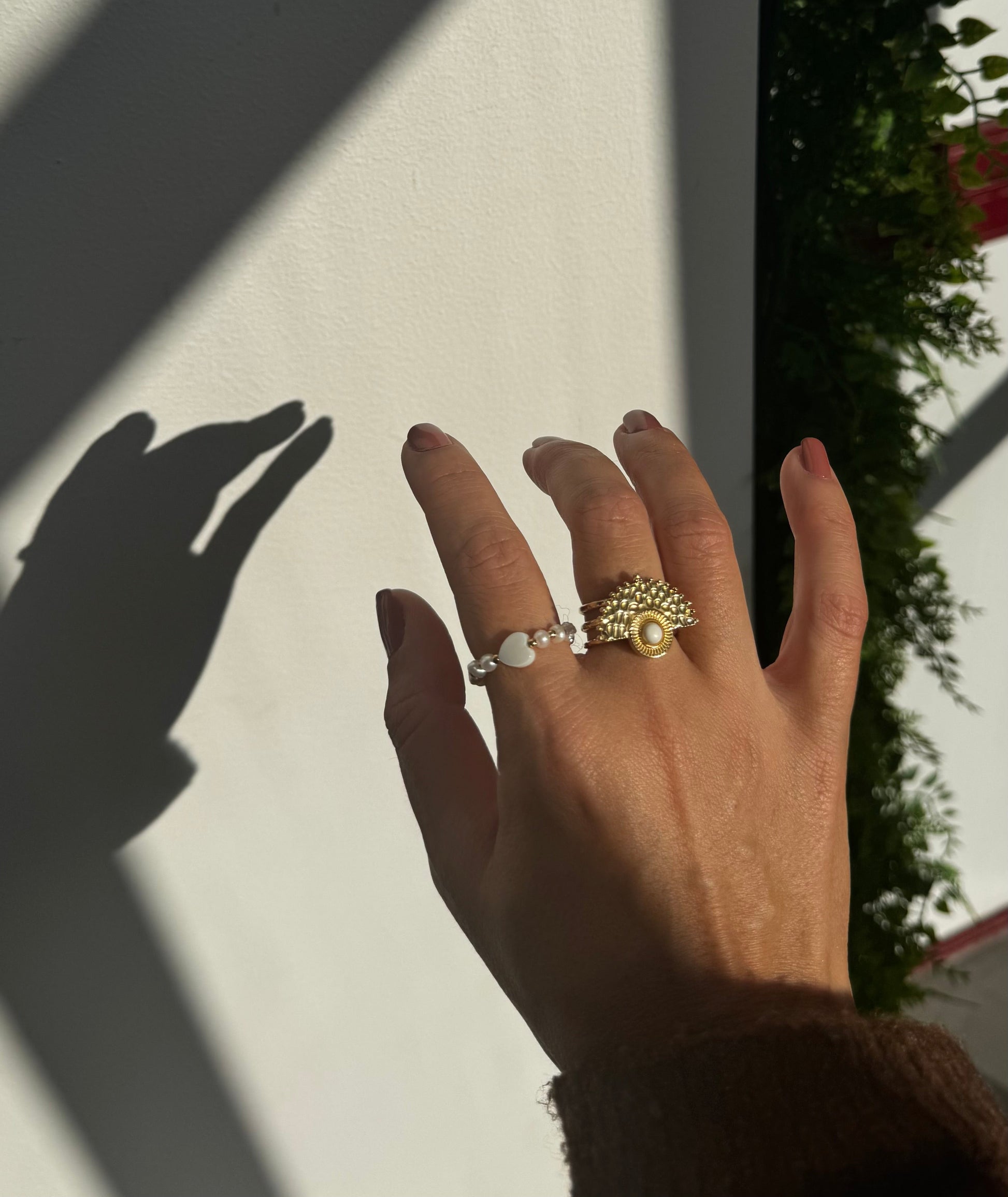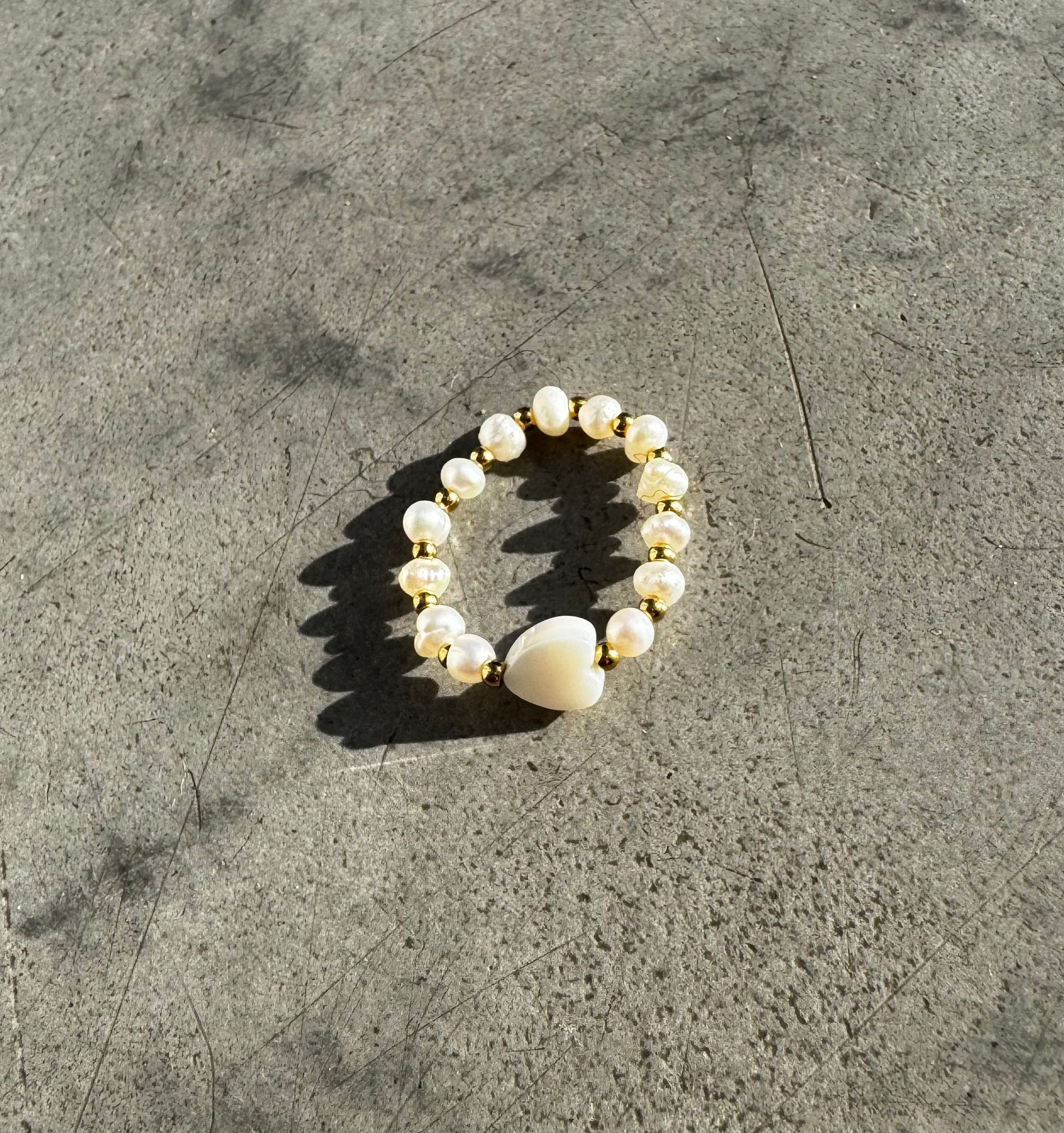 Anel elástico com coração madrepérola, pérolas e aço inoxidável.