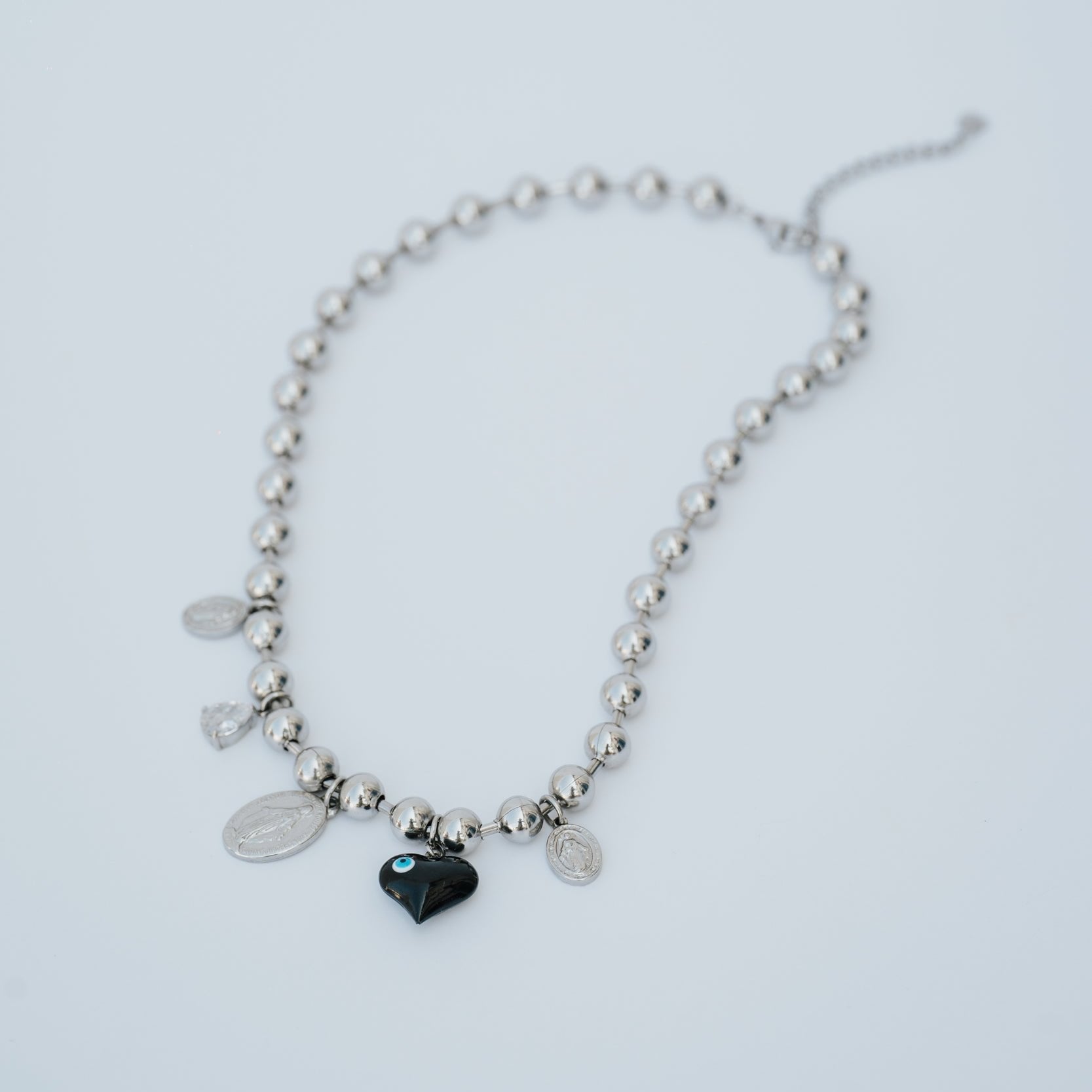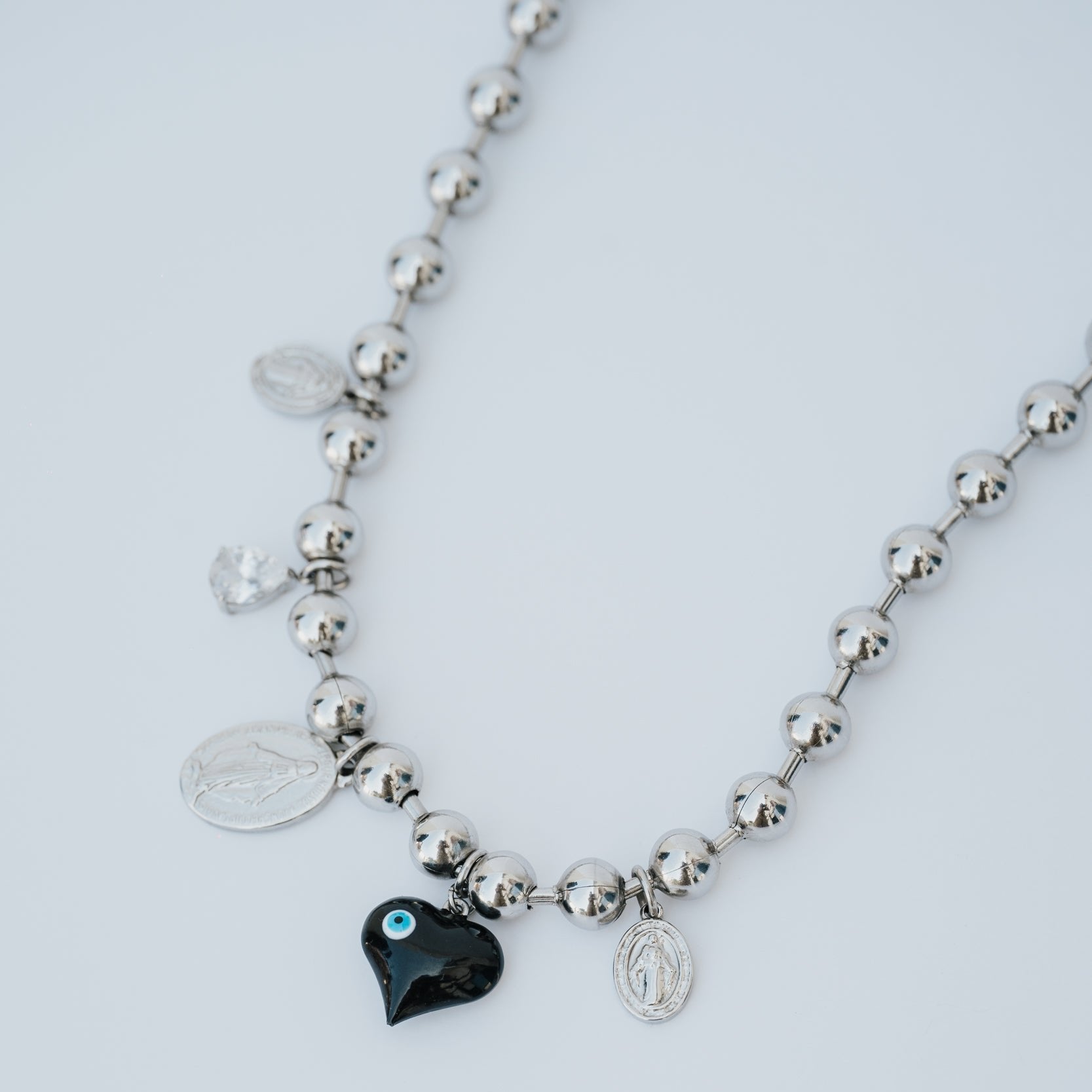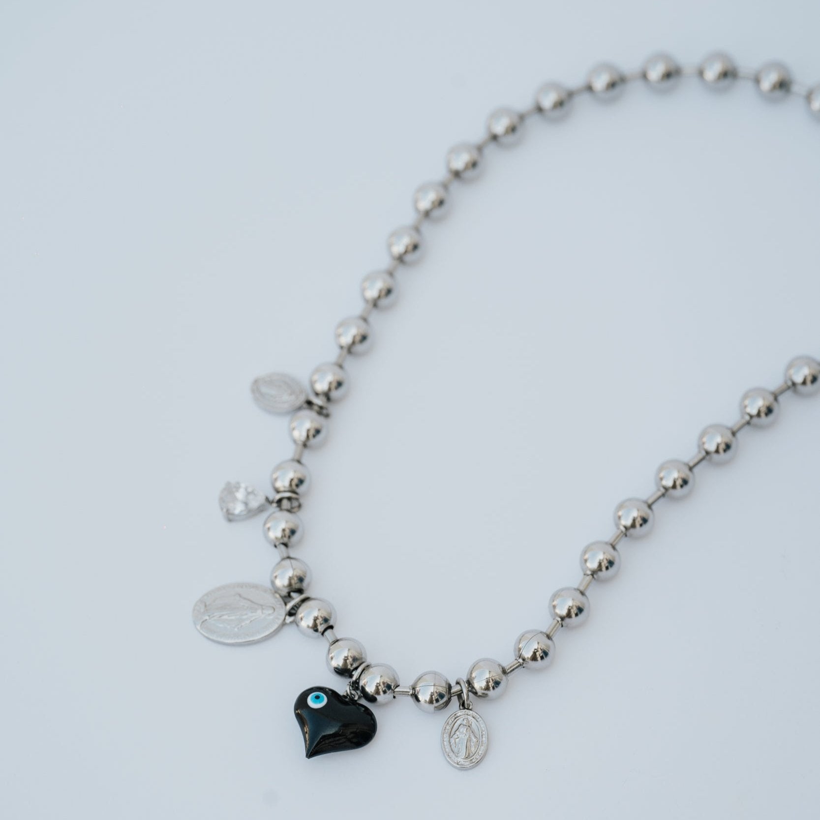 Colar Proteção Prateado Aço Inoxidável com amuletos protetores.