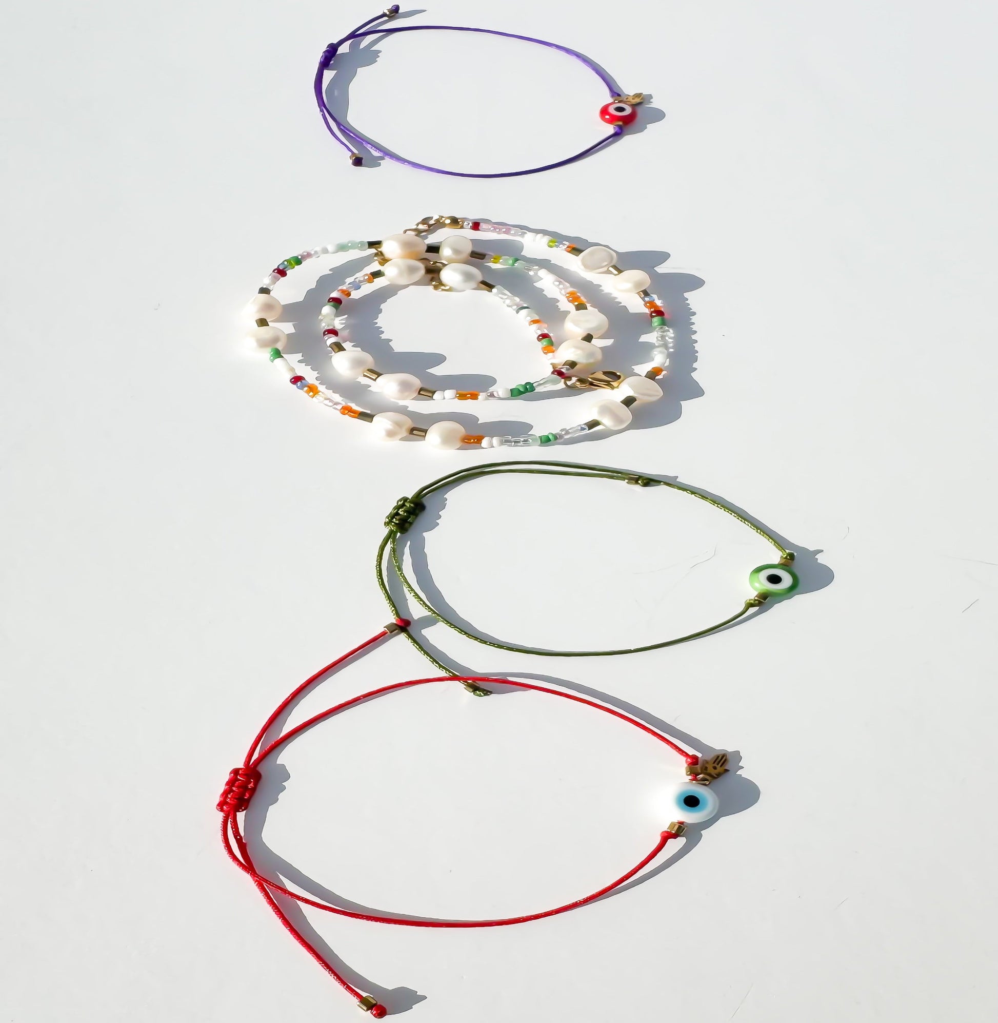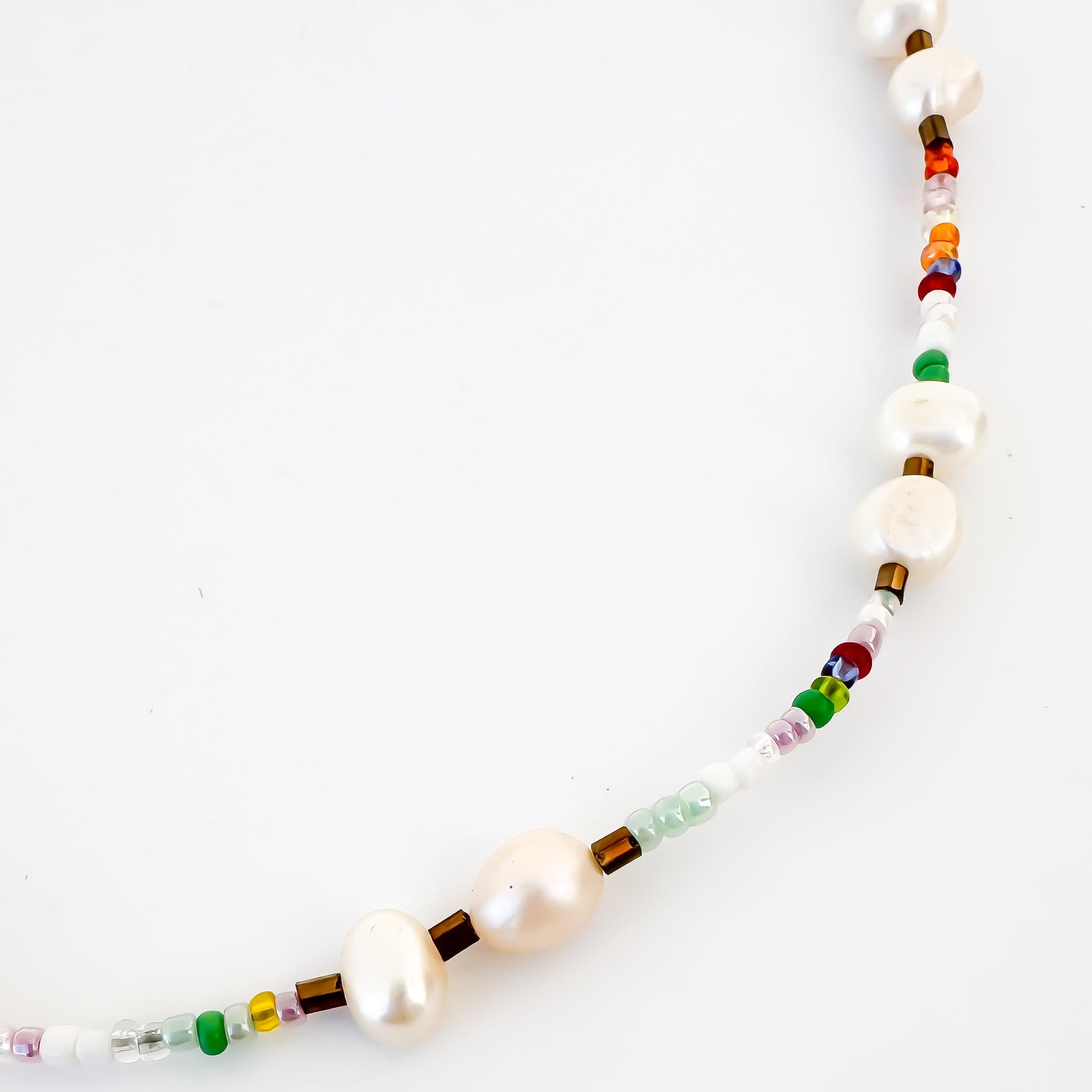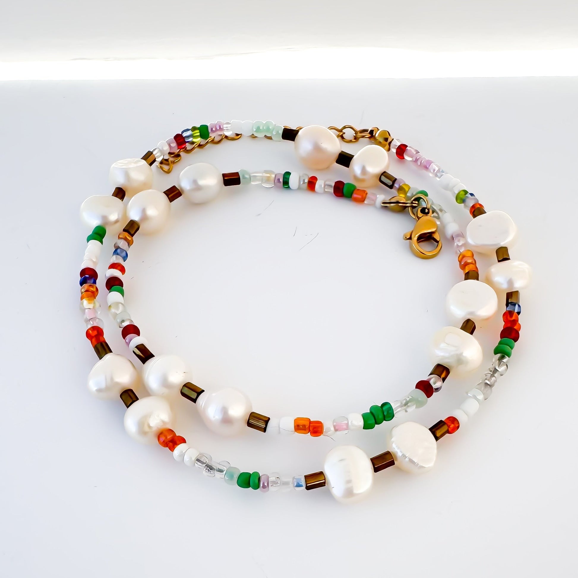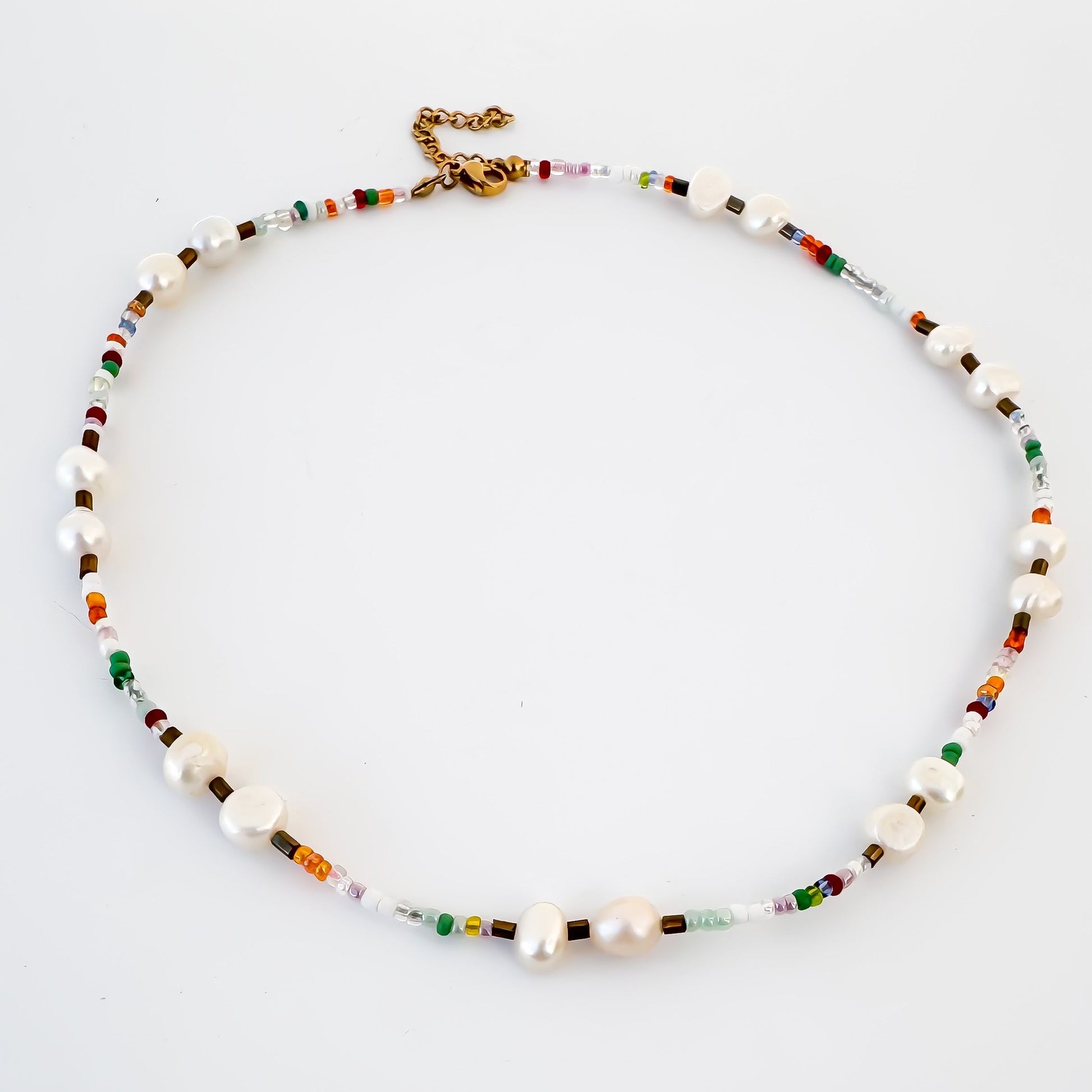 Colar mistura de pérolas de água doce e missangas coloridas, com terminações em aço inoxidável dourado. O padrão de cada um destes colares é único e não repetido, mantendo as cores, mas não o padrão de missangas.