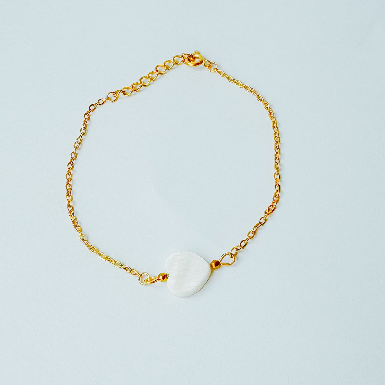 Pulseira Coração Madrepérola em aço inoxidável dourado ou prateado, feita à mão.
